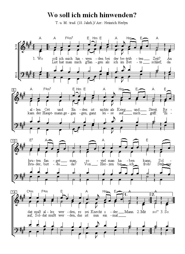 | Wo soll ich mich hinwenden | trad. (18. Jahrh.) | trad. (18. Jahrh.) | SATB | 3 | JPEG | Midi |