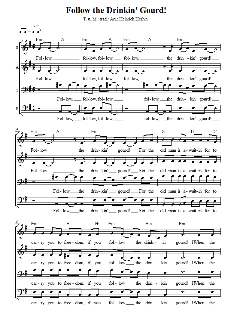 | Follow the Drinkin' Gourd | trad. | trad. | 8 | SATB | JPEG | Midi |
