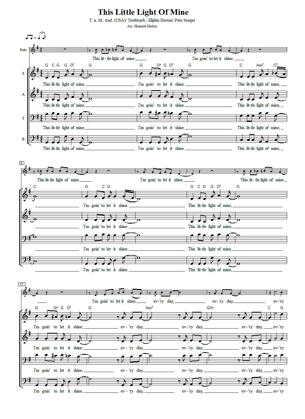 | This Little Light Of Mine | trad. Pete Seeger/ Zilphia Horton | trad. | 8 | SATB | JPEG | Midi |